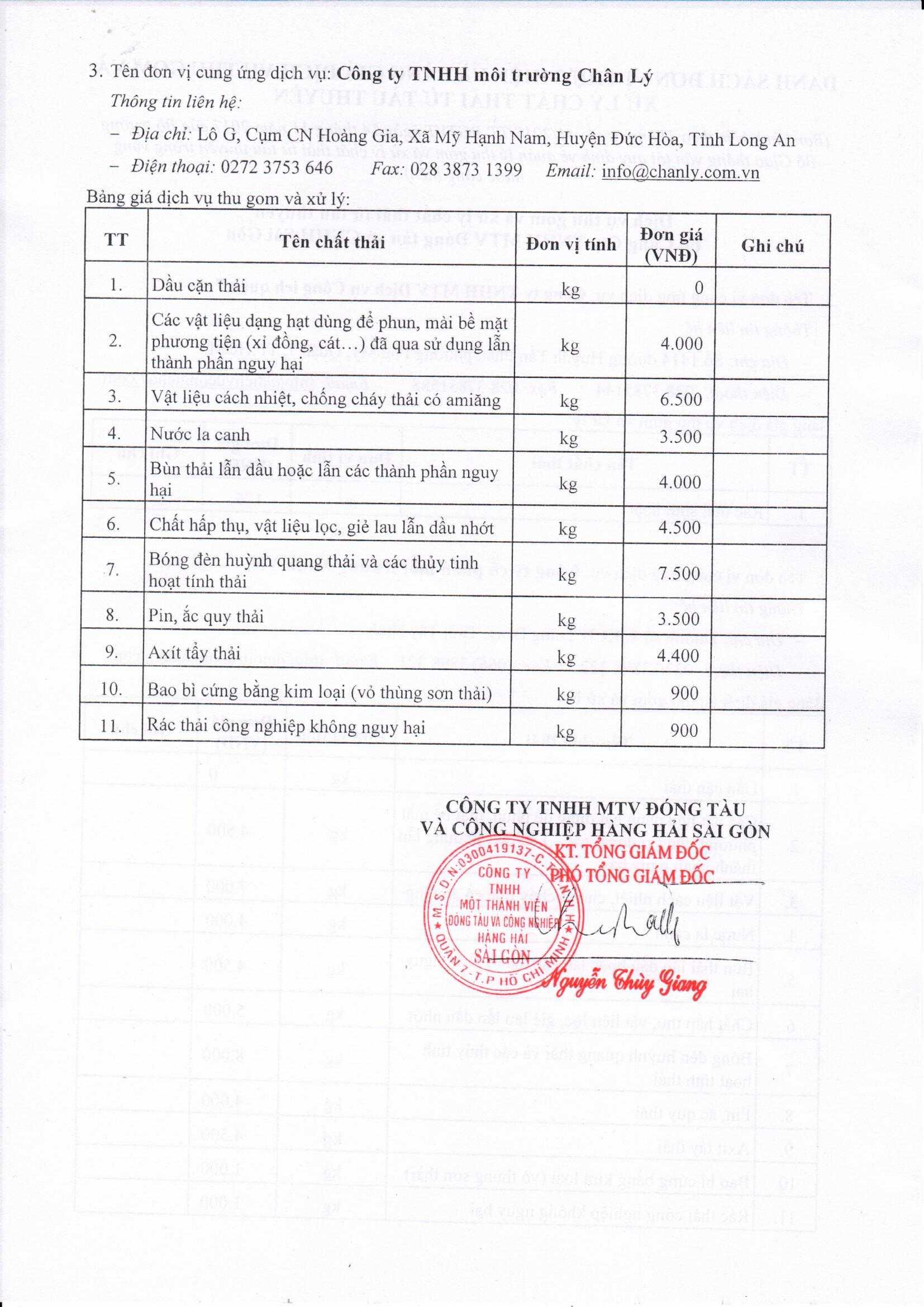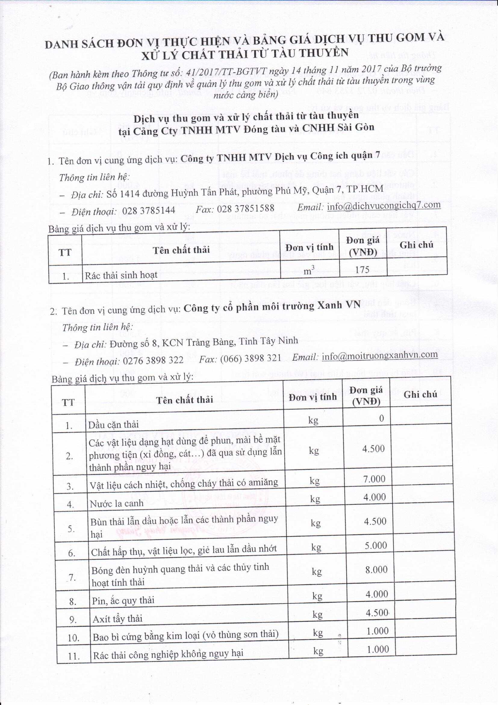 Saigon Shipmarin: danh sách tổ chức, cá nhân đã ký hợp đồng cung ứng dịch vụ thu gom và xử lý chất thải từ tàu thuyền tại cảng biển và giá dịch vụ thu gom, xử lý chất thải