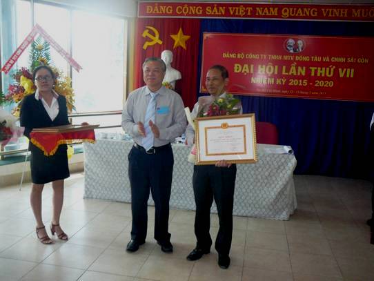 Đồng chí Đỗ Thành Hưng – Phó Bí thư Đảng ủy Tổng Công ty trao Bằng khen của Đảng ủy KDNTƯ cho Đảng ủy Sài Gòn Shipmarin